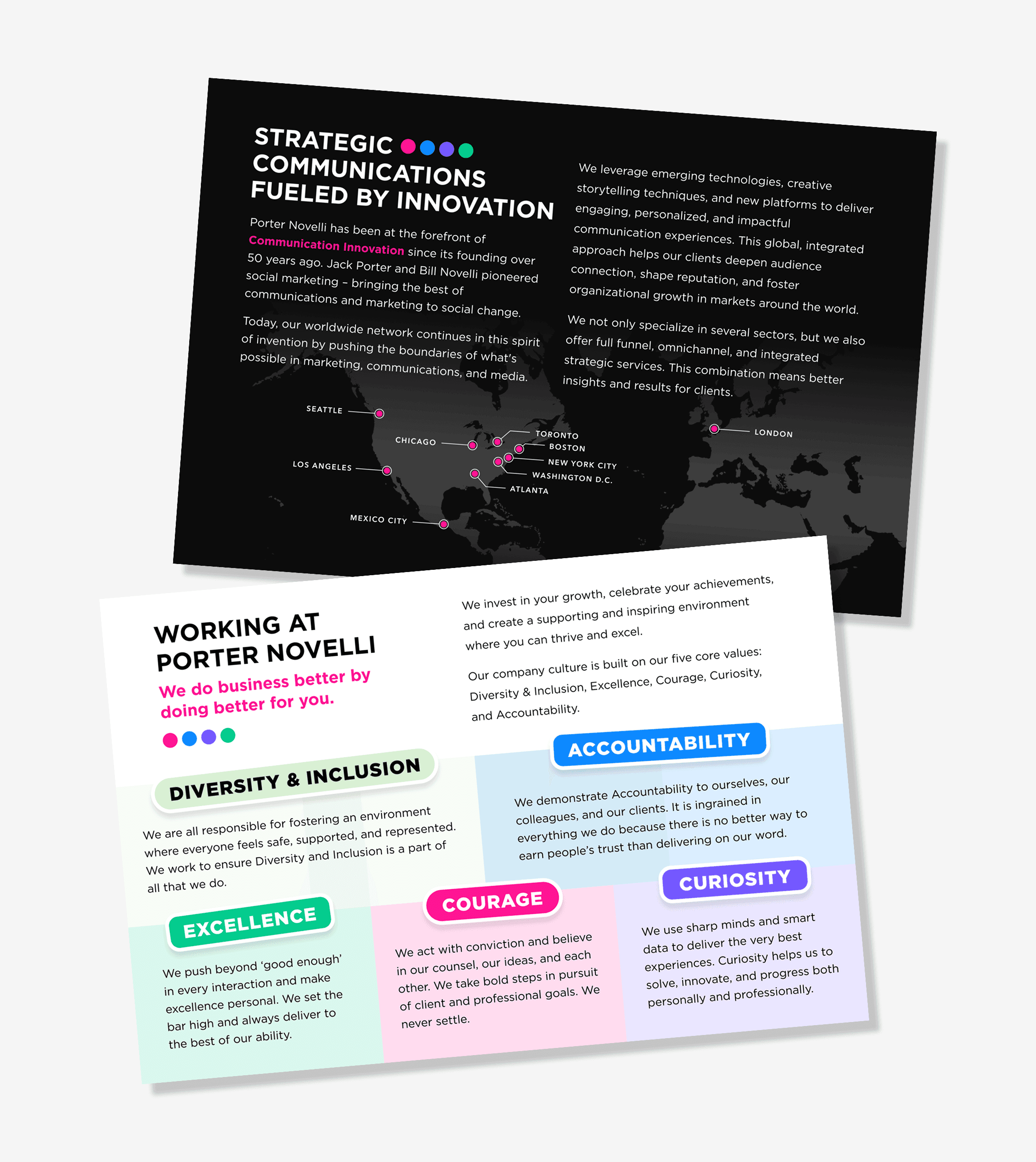Leveraging the brand system I established, I translated Porter Novelli’s refreshed identity across a wide range of internal and marketing touchpoints. This included print collateral, email templates, social assets, and the development of internal sub-brands and logos, as well as large-scale design for agency-wide events—from invitations to environmental graphics. Beyond maintaining consistency, I pushed the brand into more expressive territory, creating dynamic graphic lockups and flexible visual compositions that allowed the identity to feel energetic, modern, and ownable across teams. These extensions demonstrated how a structured brand system could also support moments of creativity, culture-building, and internal storytelling throughout the agency.