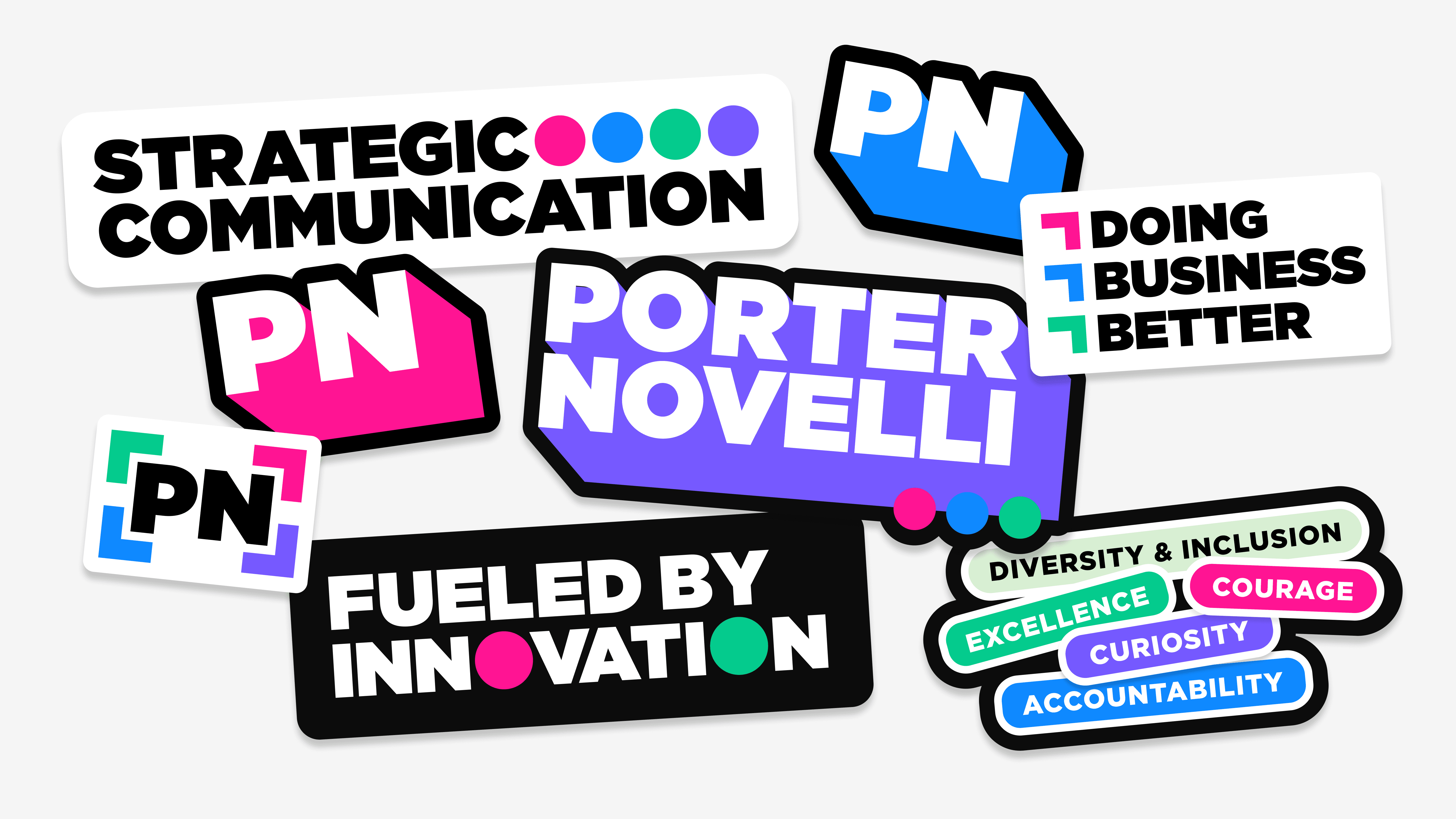 The original Porter Novelli branding was limited in its ability to translate across platforms, with visually scattered and incohesive color usage and a dated typographic presence.